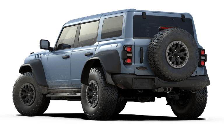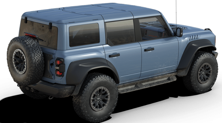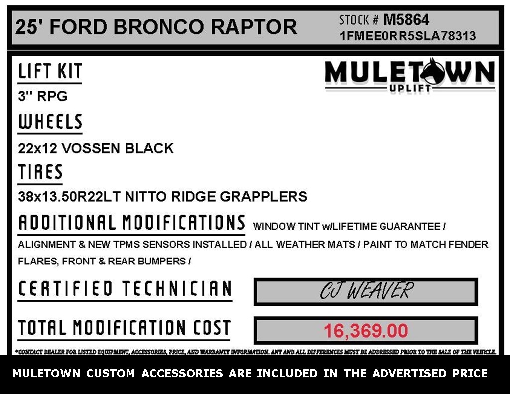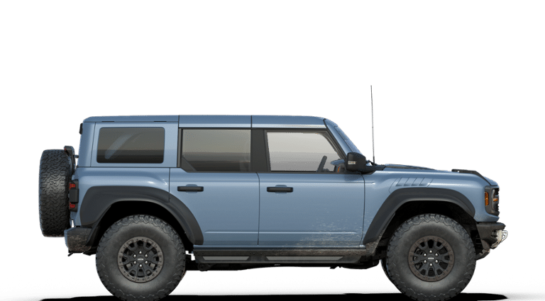 3.0L EcoBoost V6 Muletown Uplift 3" Lift w/ 38" Tires Bronco Raptor Muletown Uplift 3" Lift w/ 38" Tires, 4D Sport Utility, 3.0L EcoBoost V6, 4WD, Azure Gray Metallic Tri-Coat, 12 Speakers, ABS brakes, Auto High-beam Headlights, Auto-dimming Rear-View mirror, Brake assist, Connected Navigation, Convertible HardTop, Delay-off headlights, Equipment Group 374A Lux Package, Exterior Parking Camera Rear, Front Bucket Seats, Front Center Armrest, Front dual zone A/C, Front fog lights, Fully automatic headlights, Glass rear window, Heated door mirrors, Heated front seats, Heated steering wheel, Leather Shift Knob, Power door mirrors, Radio: B&O Sound System by Bang & Olufsen, Rear window wiper, Remote keyless entry, SiriusXM w/360L, Speed control, Split folding rear seat, Steering wheel mounted audio controls, SYNC 4, Telescoping steering wheel, Tilt steering wheel, Turn signal indicator mirrors, Variably intermittent wipers, Wheels: 17" Black High Gloss-Painted Aluminum.