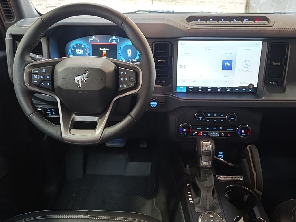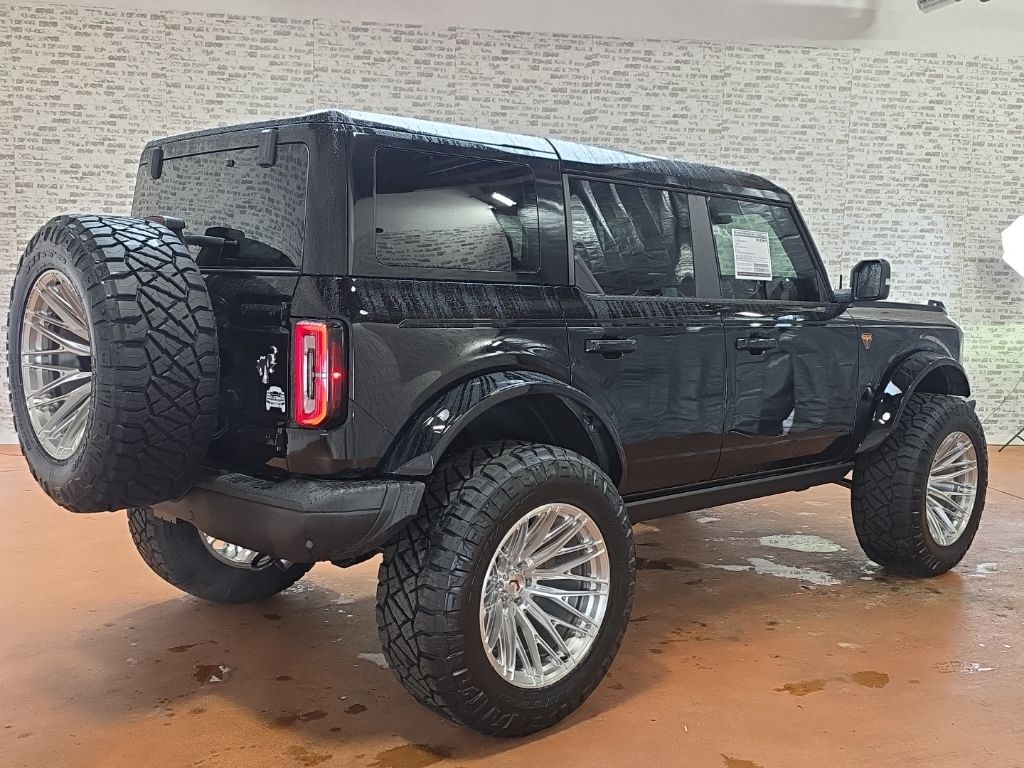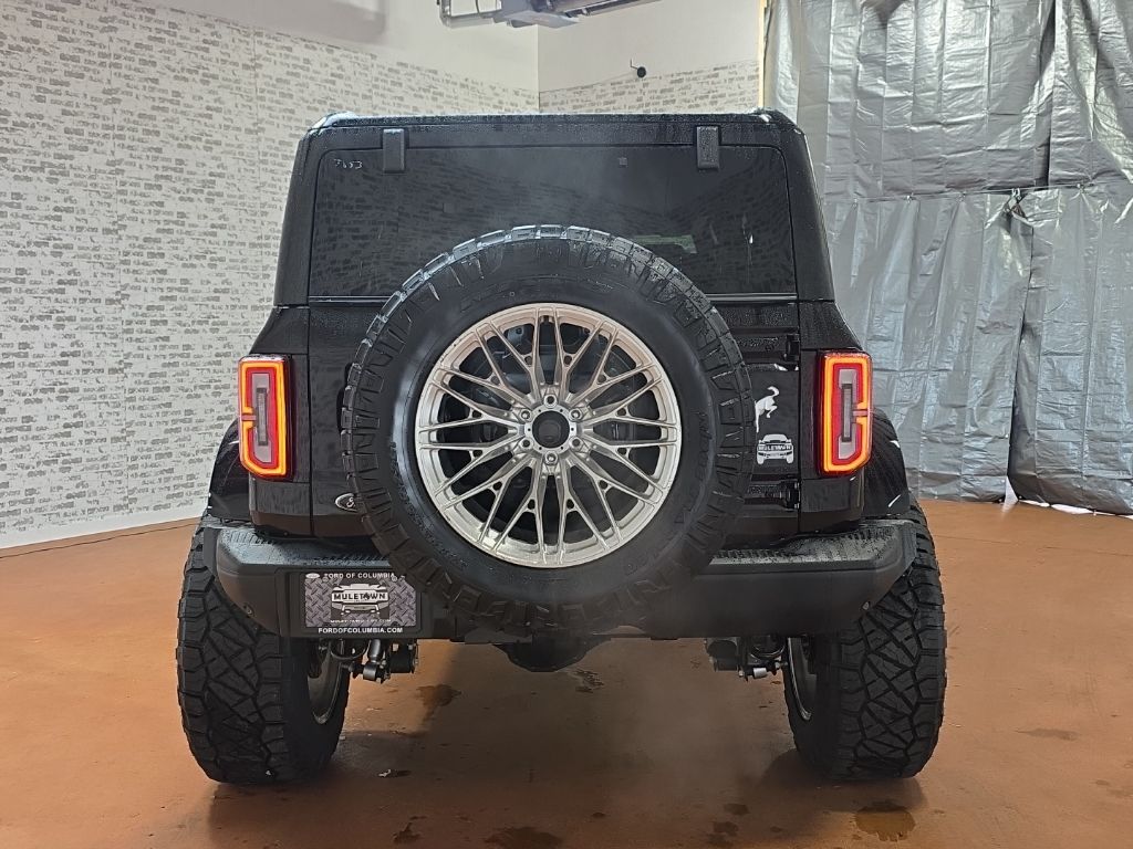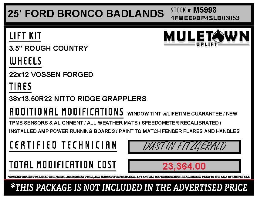 2.7L EcoBoost V6 Muletown Uplift 3.5" Lift w/ 38" Tires Bronco Badlands Muletown Uplift 3.5" Lift w/ 38" Tires, 4D Sport Utility, 4WD, Shadow Black, 2-Door Intelligent Access w/Lock/Unlock, 360-Degree Camera, 4.7 Final Drive Ratio, ABS brakes, Adaptive Cruise Control, Ambient Footwell Lighting, Auto High-beam Headlights, Body Color-Painted Hard Top, Brake assist, Connected Navigation, Delay-off headlights, Dr & Pass Illuminated Sliding Visor Vanity Mirrors, Dual Smart Charging USB Ports, Dual-Zone Electronic Automatic Temperature Control, Equipment Group 334A Lux Package, Evasive Steering Assist, Exterior Parking Camera Rear, Front Bucket Seats, Front Center Armrest, Front fog lights, Front Parking Sensors, Front Row Heated Seats, Fully automatic headlights, Hard Top Sound Deadening Headliner, Heated door mirrors, Heated front seats, High Clearance Fender Flares, High Clearance Suspension, Information on Demand Panel, Leather Shift Knob, Position-Sensitive Bilstein Shock Absorbers, Power door mirrors, Power Outlet - Back Side of Center Floor Console, Radio: B&O Sound System by Bang & Olufsen, Rear Parking Sensors, Rear-Window Defroster & Washer, Remote keyless entry, Sasquatch Package, Sideview Mirrors, SiriusXM w/360L, Speed control, Split folding rear seat, Steering wheel mounted audio controls, Telescoping steering wheel, Tilt steering wheel, Universal Garage Door Opener, Variably intermittent wipers, Wheels: 17" Black High Gloss-Painted Aluminum.