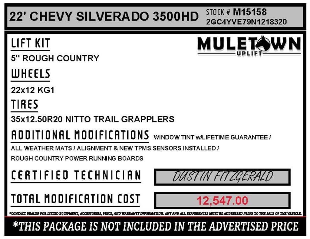 Silverado 3500HD High Country Muletown Upliftt 5" Lift w/ 35" Tires, 4D Crew Cab, 4WD, 12-Volt Rear Auxiliary Power Outlet, 120-Volt Bed Mounted Power Outlet, 120-Volt Instrument Panel Power Outlet, 170 Amp Alternator, 2nd Row Dual USB Charge-Only Ports, 6" Rectangular Chromed Tubular Assist Steps, 8" Driver Information Center, Advanced Trailering System, Auto-Dimming Inside Rear-View Mirror, Auto-Dimming Inside Rearview Mirror w/Camera, Automatic Emergency Braking, Bed View Camera w/2 Trailer Camera Provisions, Black Name Plates (LPO), Bluetooth® For Phone, Chevrolet Connected Access Capable, Chevytec Spray-On Black Bedliner w/Chevrolet Logo, Chrome Front Grille Bar w/Chrome Grille Inserts, Chrome Mirror Caps, Color-Keyed Carpeting Floor Covering, Compass Located In Instrument Cluster, Dark Essentials Package (LPO), Deep-Tinted Glass, Electric Rear-Window Defogger, Electrical Lock Control Steering Column, Following Distance Indicator, Forward Collision Alert, Front Black Bowtie Emblem (LPO), Front Carpeted Floor Mats, Front Chrome Recovery Hooks, Front LED Fog Lamps, Gooseneck/5th Wheel Prep Package, HD Surround Vision w/2 Trailer View Camera Provisions, Heated Steering Wheel, Heavy Duty Front Spring/Camper Package, High Country Deluxe, Hill Descent Control, Hitch Guidance w/Hitch View, Integrated Trailer Brake Controller, IntelliBeam Automatic High Beam On/Off, Keyless Open & Start, Lane Change Alert w/Side Blind Zone Alert, Lane Departure Warning System, Leather-Wrapped Steering Wheel, LED Cargo Area Lighting, Manual Tilt/Telescoping Steering Column, Multicolor 15" Diagonal Head-Up Display, OnStar & Chevrolet Connected Services Capable, Polished Exhaust Tip, Power Door Locks, Power Front Passenger Windows w/Express Up/Down, Power Front Windows w/Driver Express Up/Down, Power Rear Windows w/Express Down, Power Sliding Rear Window w/Defogger, Power-Adjustable Outside Mirrors, Preferred Equipment Group 3LZ, Rear Carpeted Floor Mats, Rear Cross Traffic Alert, Rear Wheelhouse Liners, Remote Vehicle Starter System, Safety Alert Seat, Safety Package II, SiriusXM w/360L, Standard Tailgate, Steering Wheel Audio Controls, Steering Wheel Mounted Electronic Cruise Control, Suspension Package, Technology Package, Unauthorized Entry Theft-Deterrent System, Universal Home Remote, Up-Level Rear Seat w/Storage Package, Wi-Fi Hotspot Capable, Wireless Charging, Wireless Phone Projection, Z71 Off-Road Package. Clean CARFAX. CARFAX One-Owner.