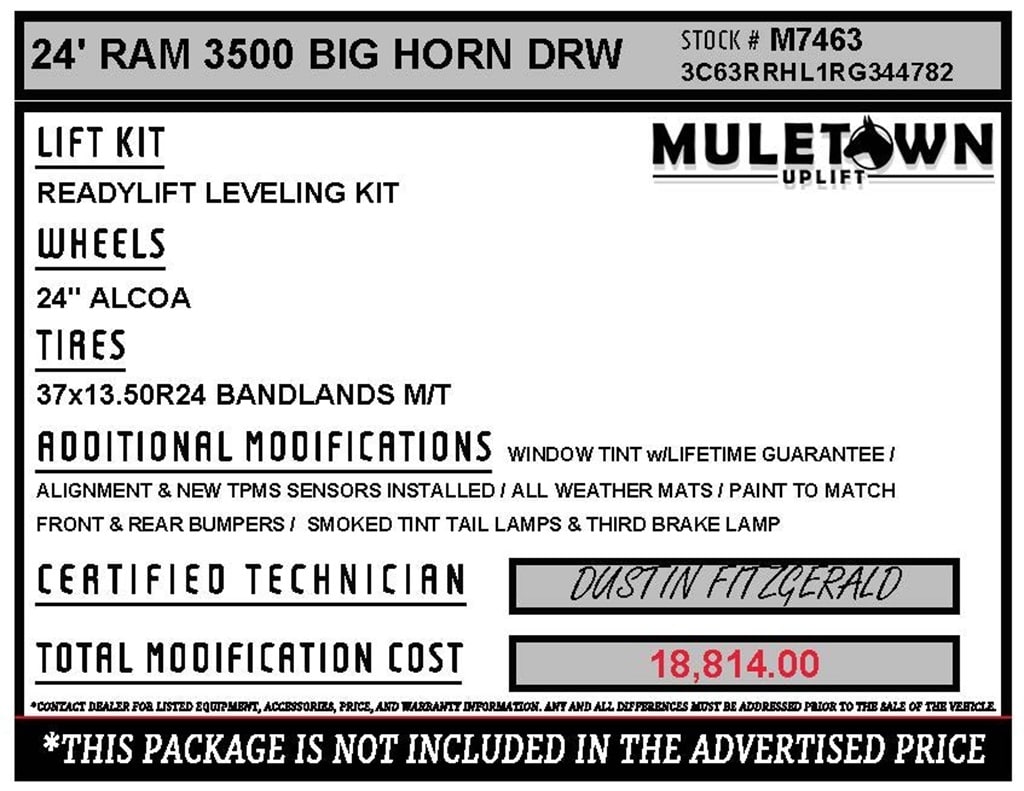 3500 Big Horn Muletown Uplift Leveling Kit w/ 37" Tires, 4D Crew Cab, 4WD, 2 Way Rear Headrest Seat, 2nd Row In Floor Storage Bins, 4 Way Front Headrests, 40/20/40 Split Bench Seat, 4G LTE Wi-Fi Hot Spot, 8.4" Touchscreen Display, All R1 Low Radios, All Radio Equipped Vehicles, Apple CarPlay, Auto Power-Folding Mirrors, Black Exterior Mirrors, Bluetooth Handsfree Phone & Audio, Center Hub, Connectivity - US/Canada, Dual Glove Boxes, Exterior Mirrors Courtesy Lamps, Exterior Mirrors w/Heating Element, Exterior Mirrors w/Supplemental Signals, Foam Bottle Insert (Door Trim Panel), Footwell Courtesy Lamp, For Details Visit DriveUconnect.com, For More Info, Call 800-643-2112, Forward & Reverse Utility Lights, Front Armrest w/Cupholders, Front Center Seat Cushion Storage, Front Fog Lamps, Front Seat Back Map Pockets, Global Telematics Box Module (TBM), Glove Box Lamp, Google Android Auto, GPS Antenna Input, Integrated Center Stack Radio, Integrated Voice Command w/Bluetooth, Leather Wrapped Steering Wheel, Level 1 Equipment Group, Locking Lower Glove Box, Manual Adjust 4-Way Front Passenger Seat, Mirror Running Lights, Power Adjust 8-Way Driver Seat, Power Adjust Mirrors, Power Heated Fold Telescopic Mirrors, Power Telescoping Mirrors, Power-Adjustable Convex Aux Mirrors, Premium Cloth 40/20/40 Bench Seat, Quick Order Package 2HZ Big Horn, Radio: Uconnect 5 w/8.4" Display, Rear 60/40 Folding Seat, Rear Dome w/On/Off Switch Lamp, Remote USB Port - Charge Only, Selectable Tire Fill Alert, SiriusXM Radio Service, SiriusXM Satellite Radio, Steering Wheel Mounted Audio Controls, Storage Tray, Wheels: 18" x 8.0" Polished Aluminum. CARFAX One-Owner.