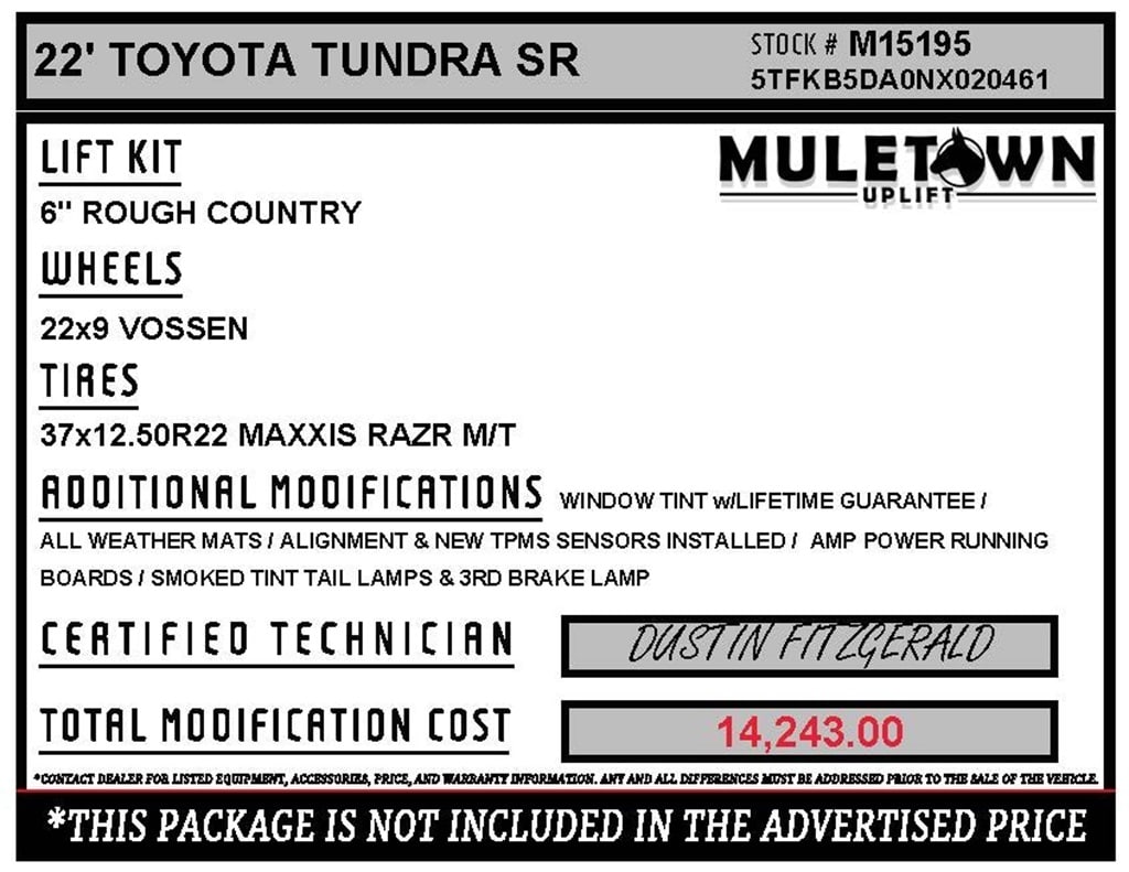 Tundra SR Muletown Uplift 6" Lift w/ 37" Tires, 4D Double Cab, 4WD, 22 Gallon Fuel Tank, Cold Weather Package Delete, Front Fog & Driving Lamp Delete, Front Spoiler Delete, Parking Support Alert/Brake Delete, SR Package, SR Tow Package, Towing Package Delete, Windshield Deicer Delete.