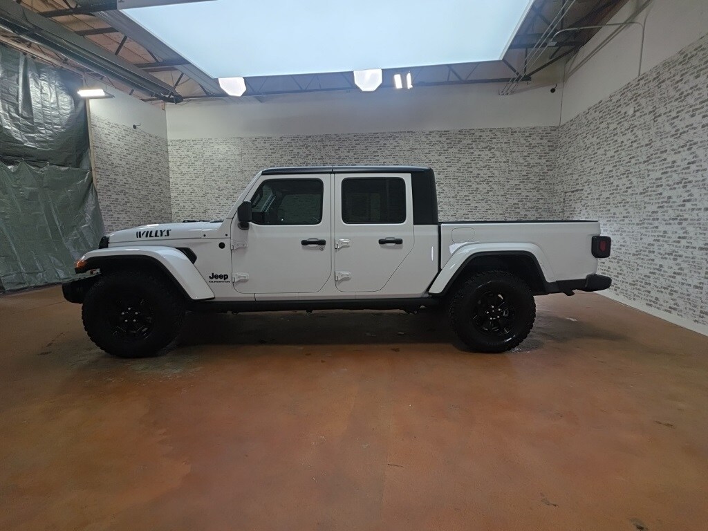 Gladiator Willys, 4D Crew Cab, 4WD, 1-Year SiriusXM Guardian Trial, 115V Auxiliary Power Outlet, 220 Amp Alternator, 240 Amp Alternator, 4-Wheel Drive Decal, 400W Inverter, 5-Year SiriusXM Traffic Service, 5-Year SiriusXM Travel Link Service, 7.0" Touch Screen Display, 700 Amp Maintenance Free Battery, 8.4" Radio & Premium Audio Group, 8.4" Touchscreen Display, 97 mph Maximum Speed Calibration, Air Conditioning w/Auto Temperature Control, Alpine Premium Audio System, Anti-Spin Differential Rear Axle, Apple CarPlay, Auto-Dimming Rear-View Mirror, Automatic Headlamps, Auxiliary Switch Group, Auxiliary Switches, Black Grille, Black Trail Rated Badge, Body Color Fender Flares (2-Piece), Bridgestone Brand Tires, Class IV Hitch Receiver, Cluster 7.0" TFT Color Display, Console Bin Task Light, Convenience Group, Daytime Running Lamp System, Deep Tint Sunscreen Windows, Emergency/Assistance Call, For Details, Visit DriveUconnect.com, For More Info, Call 800-643-2112, Front 1-Touch Down Power Windows, Front Heavy Duty Red Accent Shock Absorbers, Google Android Auto, GPS Antenna Input, GPS Navigation, HD Radio, Heavy-Duty Engine Cooling, Integrated Center Stack Radio, Integrated Voice Command w/Bluetooth, Leather Wrapped Steering Wheel, Media Hub w/2 Charge Only USBs, Mold In Color Bumper w/Gloss Black, MOPAR All-Weather Floor Mats, Off-Road Info Pages, Power Heated Mirrors, Power Tailgate Lock, Protection Sill Rails, Quick Order Package 24W Willys, Radio: Uconnect 4 w/7" Display, Radio: Uconnect 4C Nav w/8.4" Display, Rear Heavy Duty Red Accent Shock Absorbers, Remote Keyless Entry, Security Alarm, SiriusXM Radio Service, SiriusXM Satellite Radio, SiriusXM Traffic Plus, SiriusXM Travel Link, Speed Sensitive Power Locks, Sun Visors w/Illuminated Vanity Mirrors, Technology Group, Trailer Hitch Zoom, Trailer Tow Package, Universal Garage Door Opener, USB Host Flip, Wheels: 17" x 7.5" Black Aluminum w/Gray Pad, Willys, Willys Hood Decal.